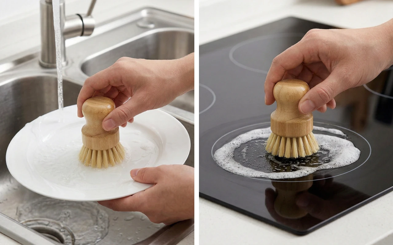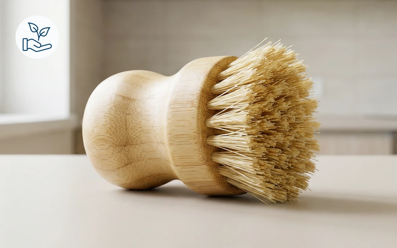 Sustainable bamboo handle and natural bristles replace plastic sponges. Durable construction reduces waste while keeping kitchens looking beautifully tidy.