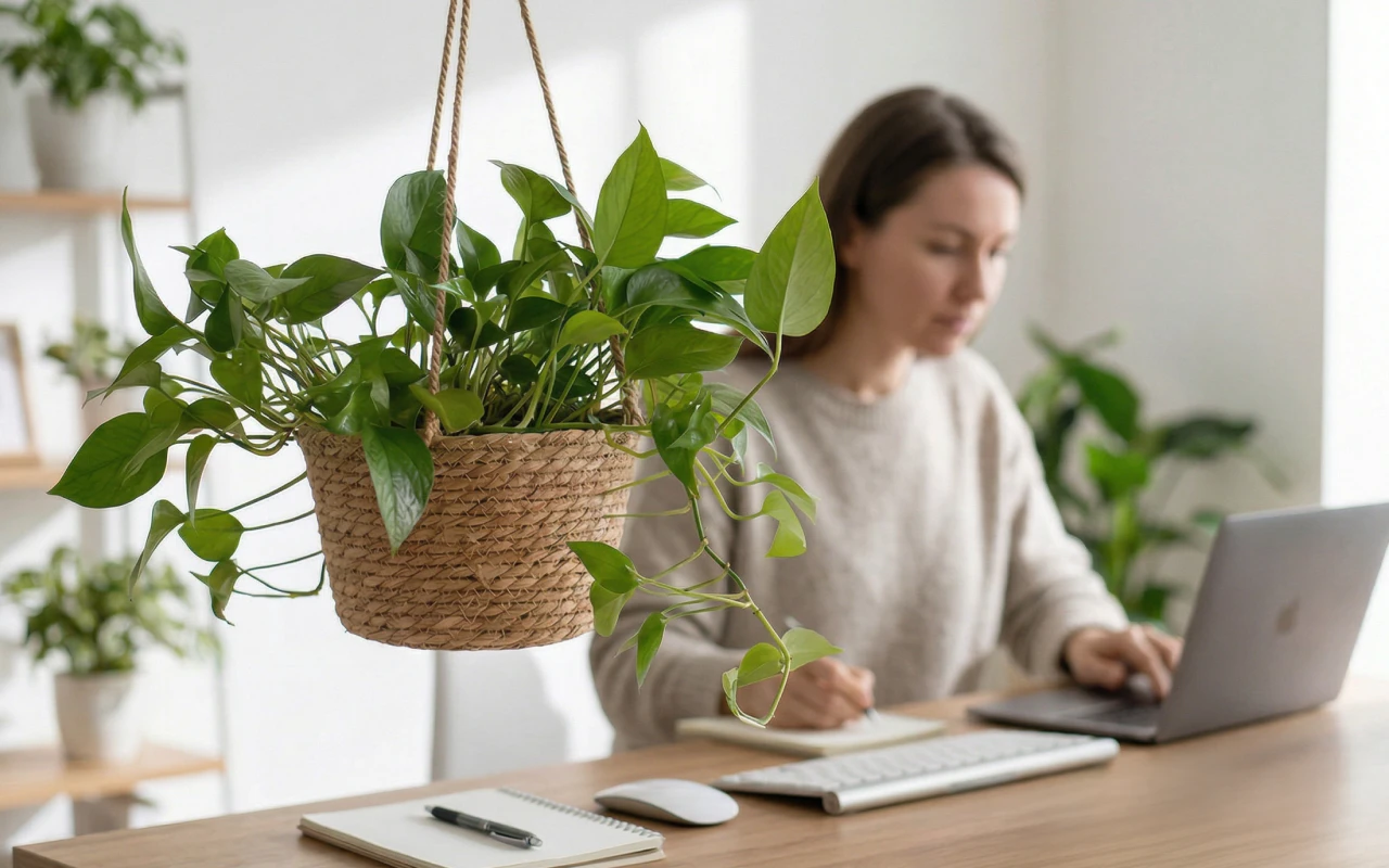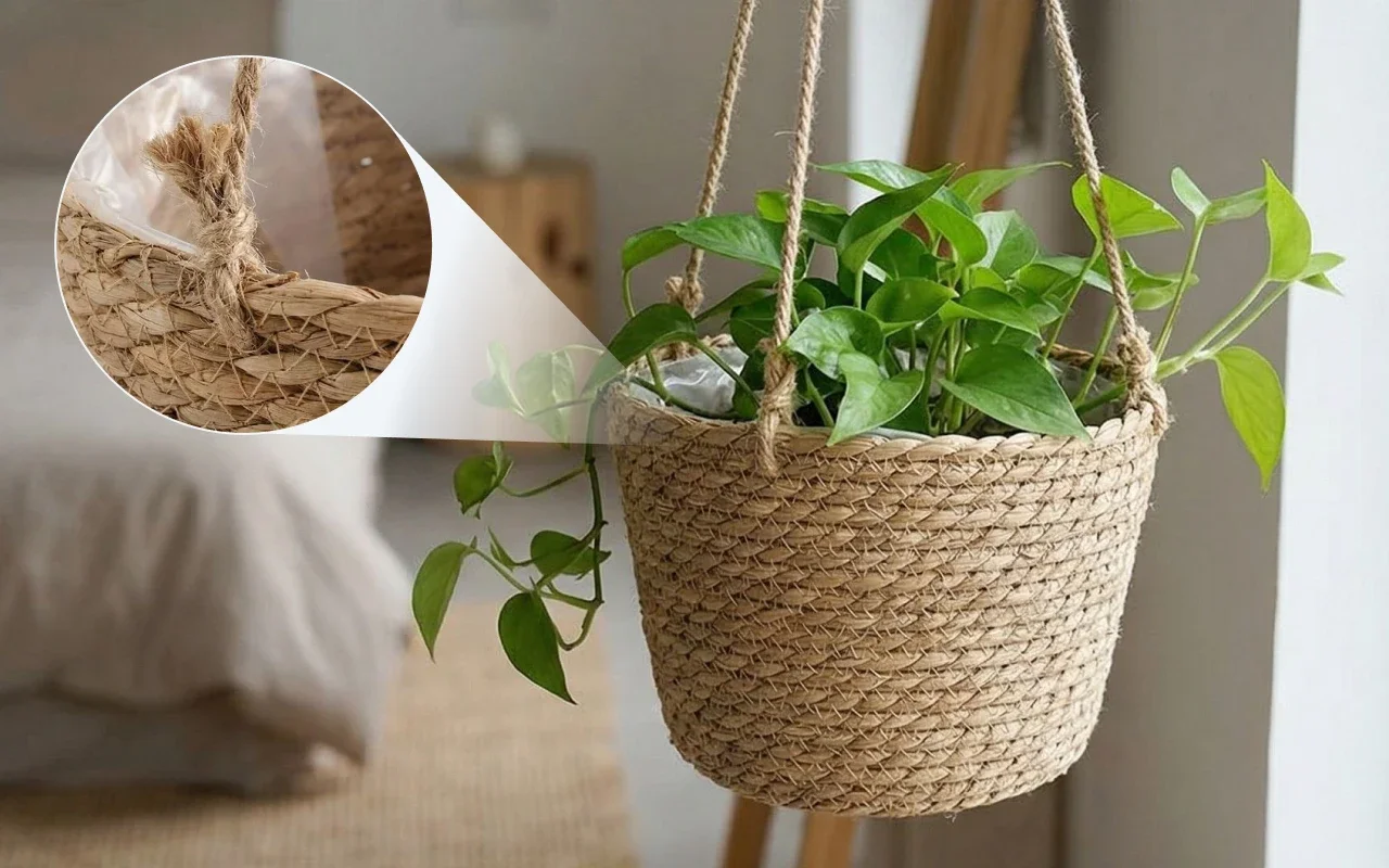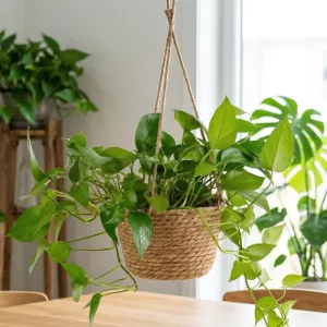Free crowded tables by lifting lush leaves onto hanging jute. Enjoy airy rooms where children move easily around displayed greenery.
