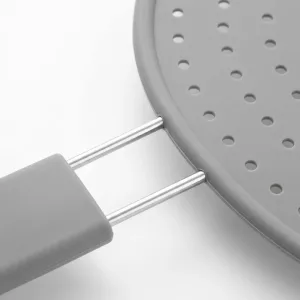 Nygex handle covering stays cool, even over strong gas flames. Grip feels secure and steady, preventing slips during draining tasks.