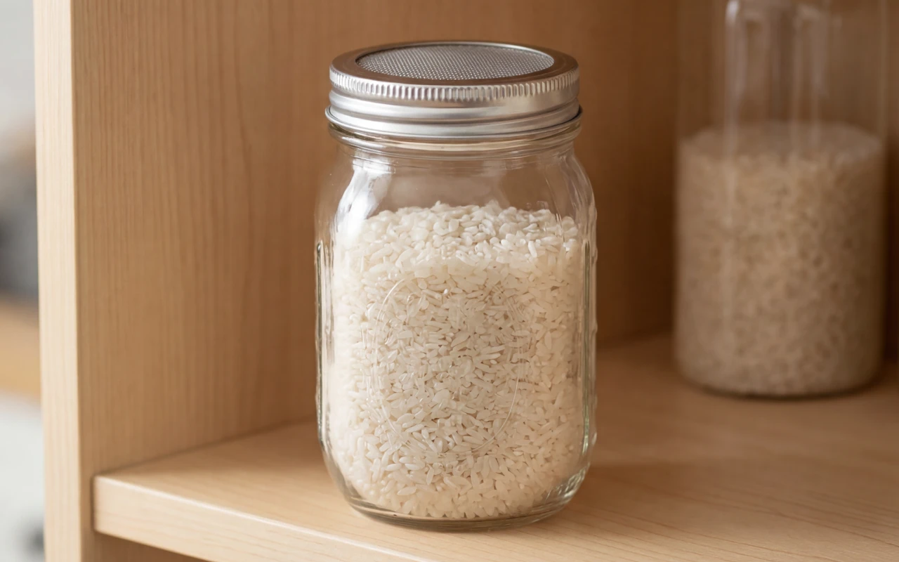 Store dry rice, oats, nuts, and herbs neatly between growing batches. Durable glass plus stainless-steel top replaces the clutter of separate sieve cloths.