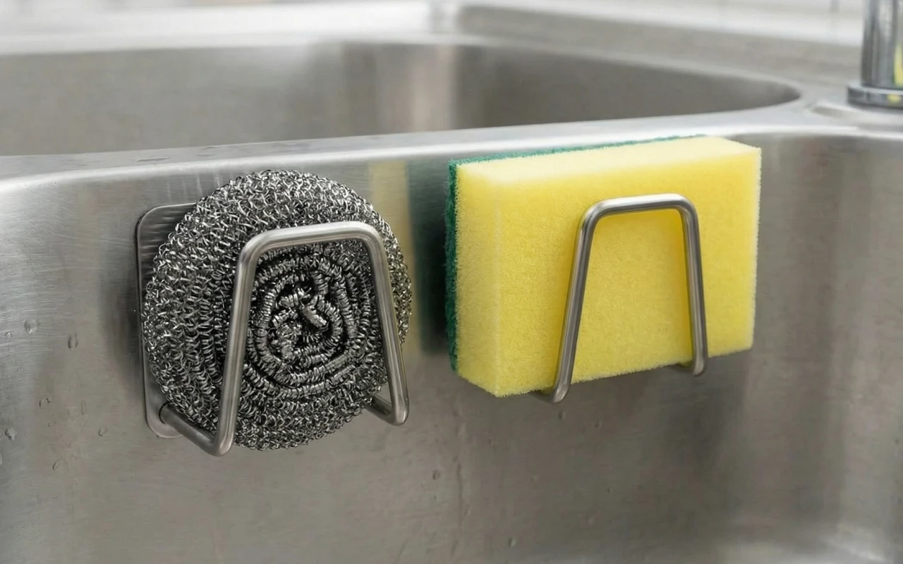 Nygex sponge bracket gathers scrubbers neatly instead of cluttering corners. Every cleaner has a clear resting place, saving time searching.